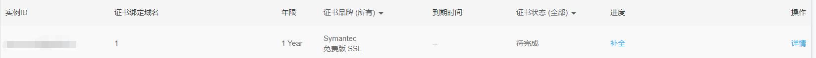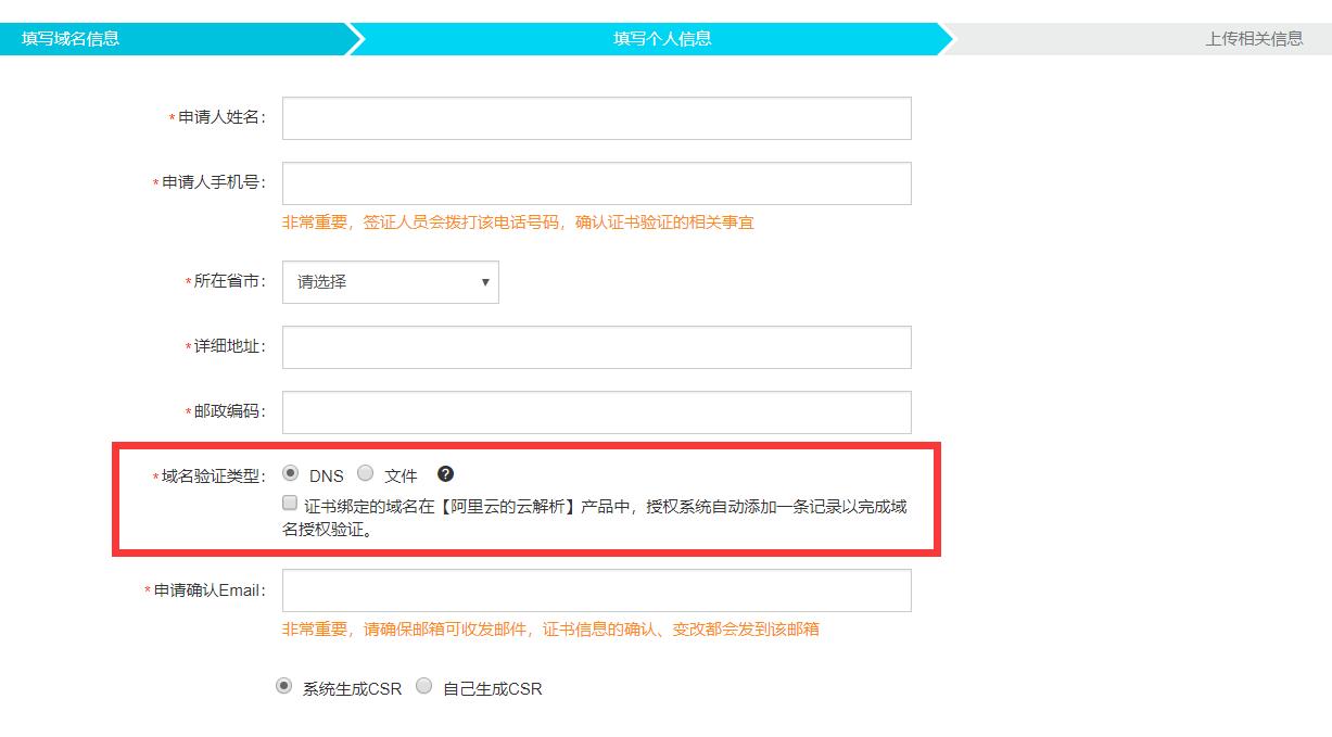 - 支付成功后,点击进入证书控制台,然后点击补全,填写相关信息,提交申请。![]() ![]() 域名验证类型选项记得勾选:证书绑定的域名在【阿里云的云解析】产品中,授权系统自动添加一条记录以完成域名授权验证。