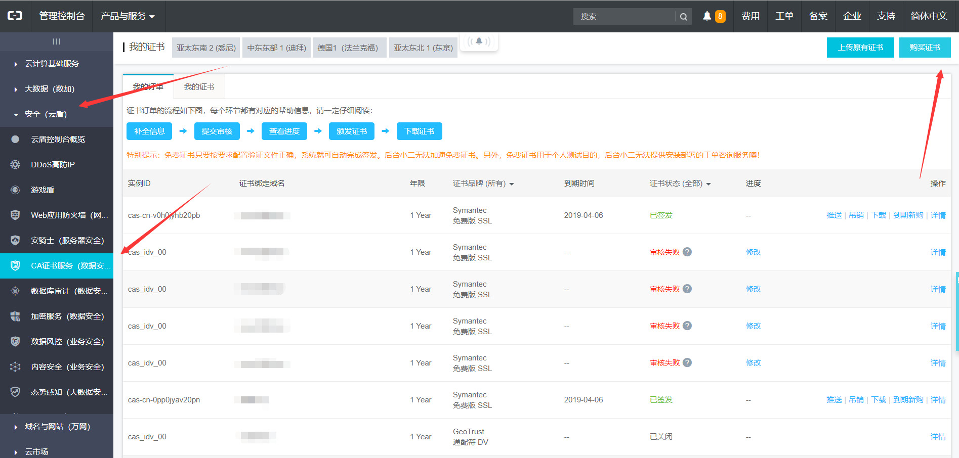 - 进入阿里云控制台,依次点击安全(云盾)->CA证书服务,然后点击右上角的购买证书。![]()