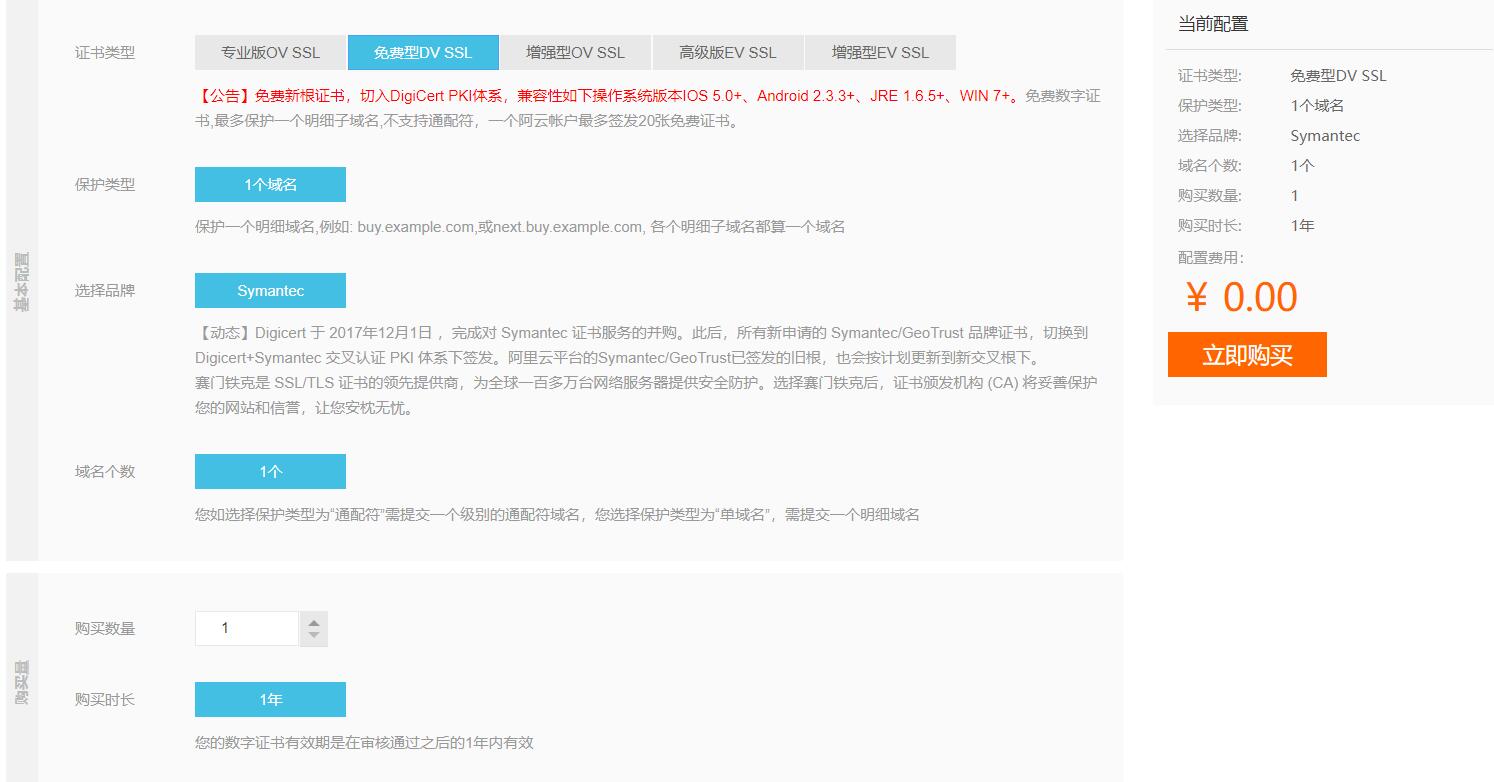 - 依次选择品牌为Symantec,保护类型为一个域名,证书类型此时会多出一个选项免费型DV SSL点击选择,然后点击立即购买,支付0.00元。![]() ![]()
